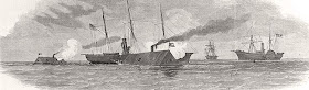 Ironclads USS Passaic, Patapsco and Nahant bombarding Ft. McAllister. Note monitor Montauk hanging back with the wooden gunboats.